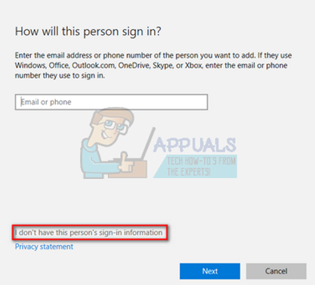 - Now Windows will guide you through its wizard on how to create a new account. When the new window comes forth, click “I don’t have this person’s sign-in information”.