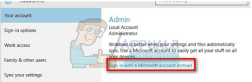 - Now navigate to Settings > Accounts > Your Account and select the option “Sign in with a Microsoft Account instead”.
