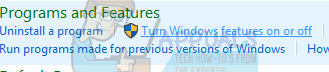 - Once you are in the menu, click on “Turn Windows features on or off” present under the subheading of Programs and Features.