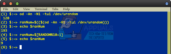 This will set the variable ranNum to a number between 1 and 256, selected at the time you run it. You can run it from the command line or from inside of a script and it should work either way. Keep in mind that you can replace ranNum with any valid variable name.