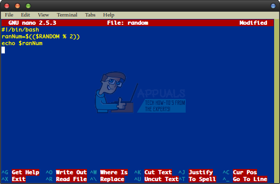 Type nano random or vi random to begin, though you could use a different name for your script if you’d like. You could also use another text editor as well if you’d prefer. Say you wanted to create one that would return either 1 or 0 when typed at the command line. Enter the following and then push Ctrl+O to save it if you’re using nano: