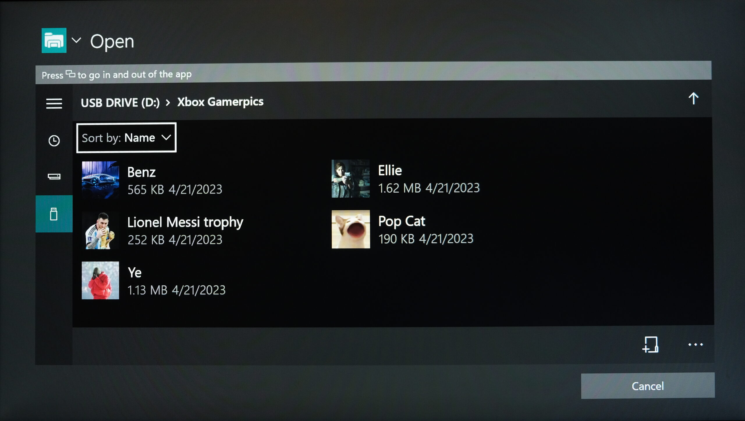 The UI for accessing pictures on an external drive for the custom gamerpic - Use your controller, or connect a keyboard/mouse, to navigate through the drive and find the picture you want to use as your gamerpic, and select it.