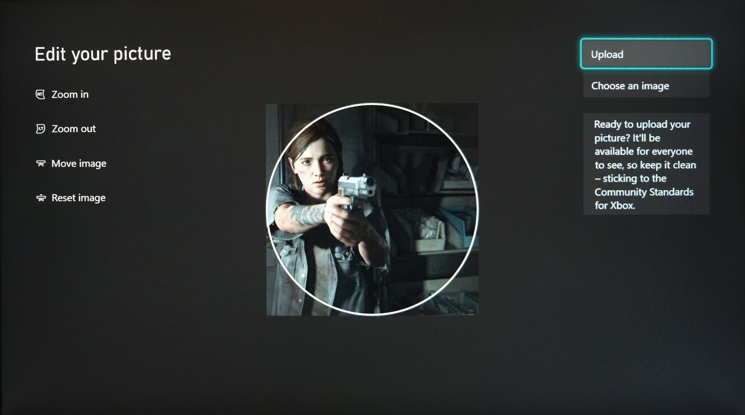 Crop the picture using the on-screen instructions on the left - Then press A to select “Upload” and that’s it! Your gamerpic should be updated within a few seconds.