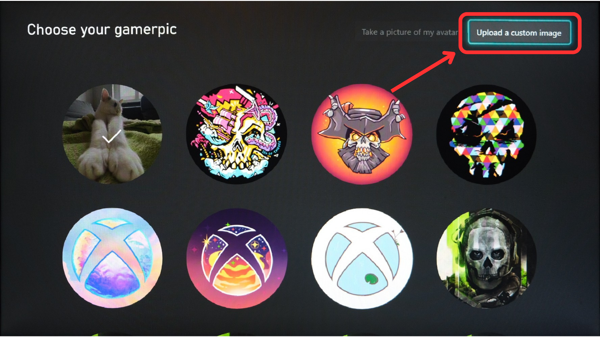Select the option to change your gamerpic - Select the “Upload a custom image” option located at the top-right of the screen.