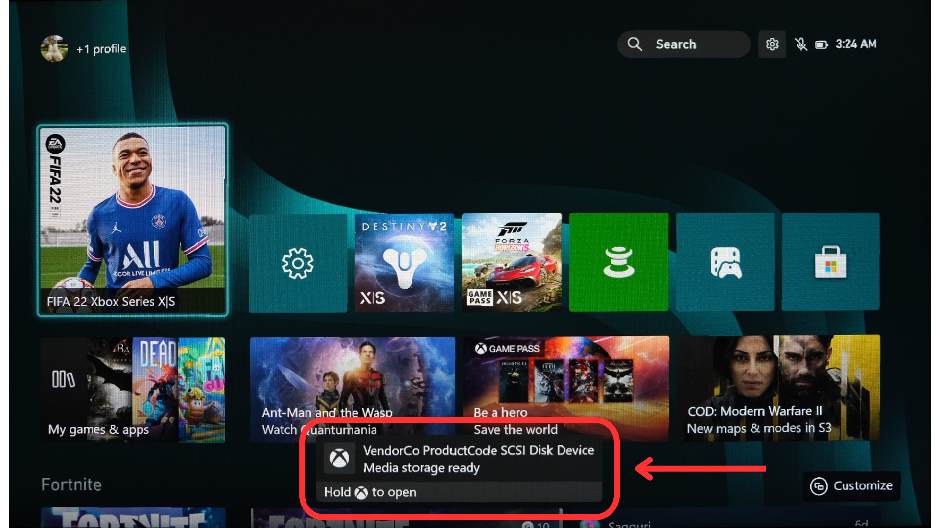 A USB drive plugged into an Xbox Series X - Wait for it to get recognized by the console, you should see a notification pop-up on your screen.