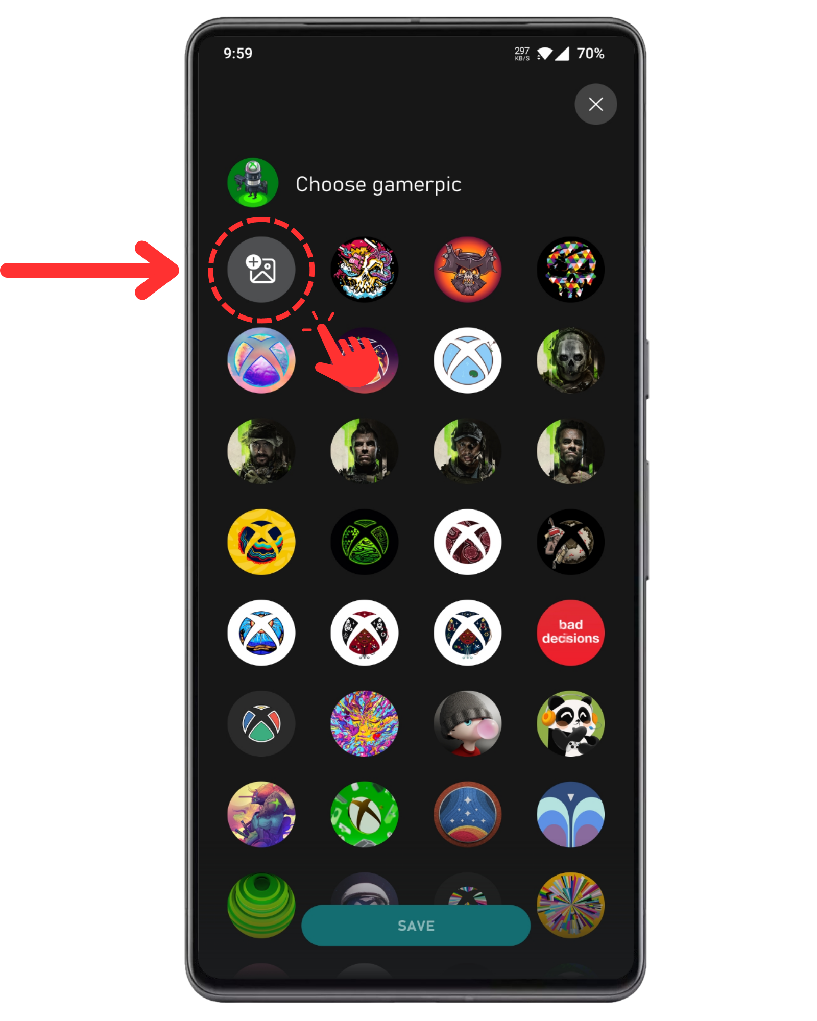 On this page, you will see a ton of preloaded gamerpics ranging from popular mascots to diverse renditions on the Xbox logo. But you want to look past all the enticing options and tap the first icon in grey color, which is for selecting custom pictures.