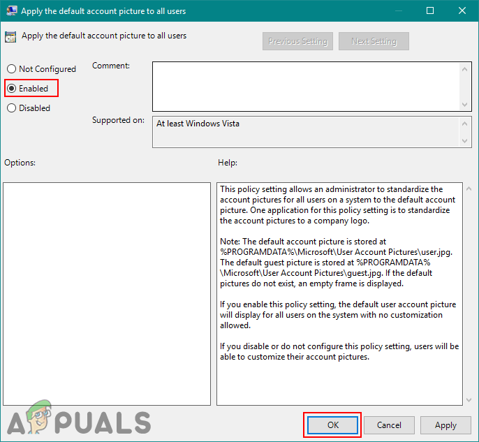 Opening the policy - In the right pane, double-click the policy named “Apply the default account picture to all users“. To enable this policy, modify the toggle from Not Configured to Enabled option. Then, click the Ok/Apply button to apply the changes.