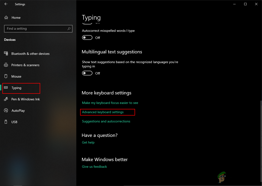 Opening Devices setting in the Windows Settings - On the left pane of devices, click on the Typing option. Now scroll down and click on the Advanced Keyboard Settings option.