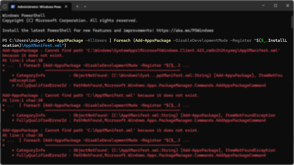 Get-AppXPackage -AllUsers | Foreach {Add-AppxPackage -DisableDevelopmentMode -Register "$($_.InstallLocation)\AppXManifest.xml"}