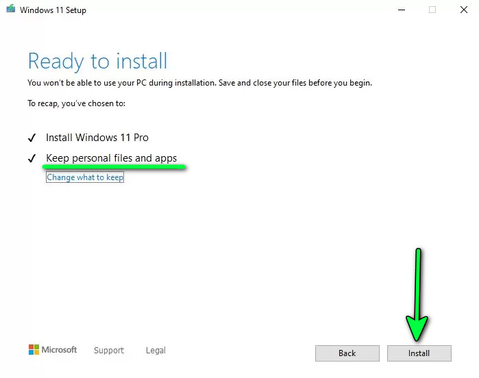 - When prompted, choose Keep personal files and apps to retain your existing data.