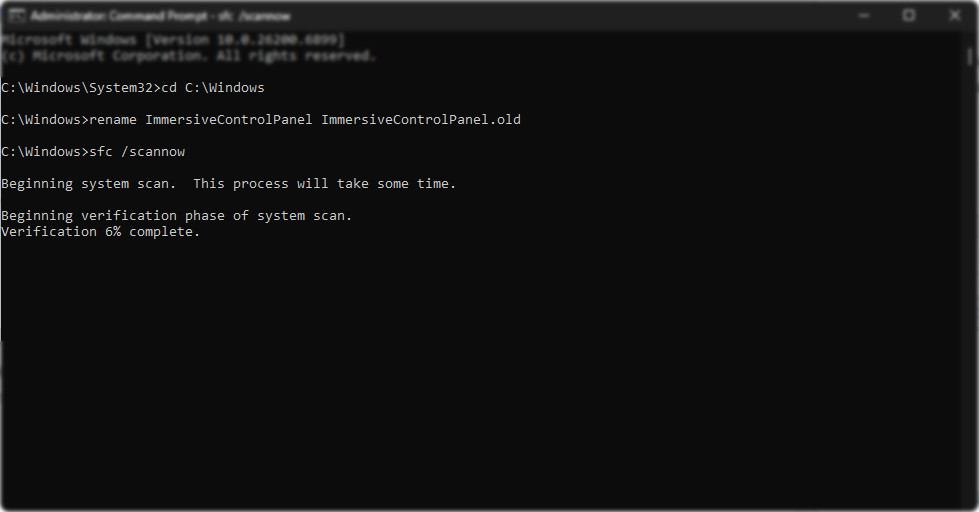 cd C:\Windows rename ImmersiveControlPanel ImmersiveControlPanel.old sfc /scannow