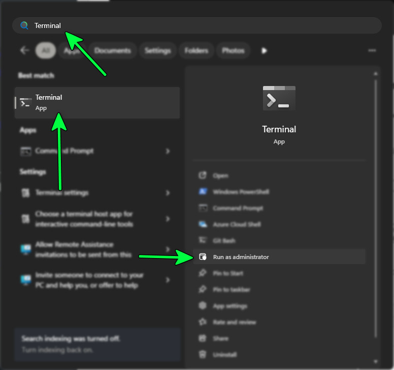 - Right-click the Start button and select Windows PowerShell (Admin) or Terminal (Admin).
