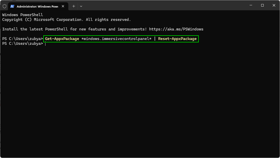 If the Immersive Control Panel package becomes unlinked or corrupted, Windows cannot start it. Re-registering through PowerShell rebuilds its manifest entries and resets all related permissions, often restoring functionality instantly.