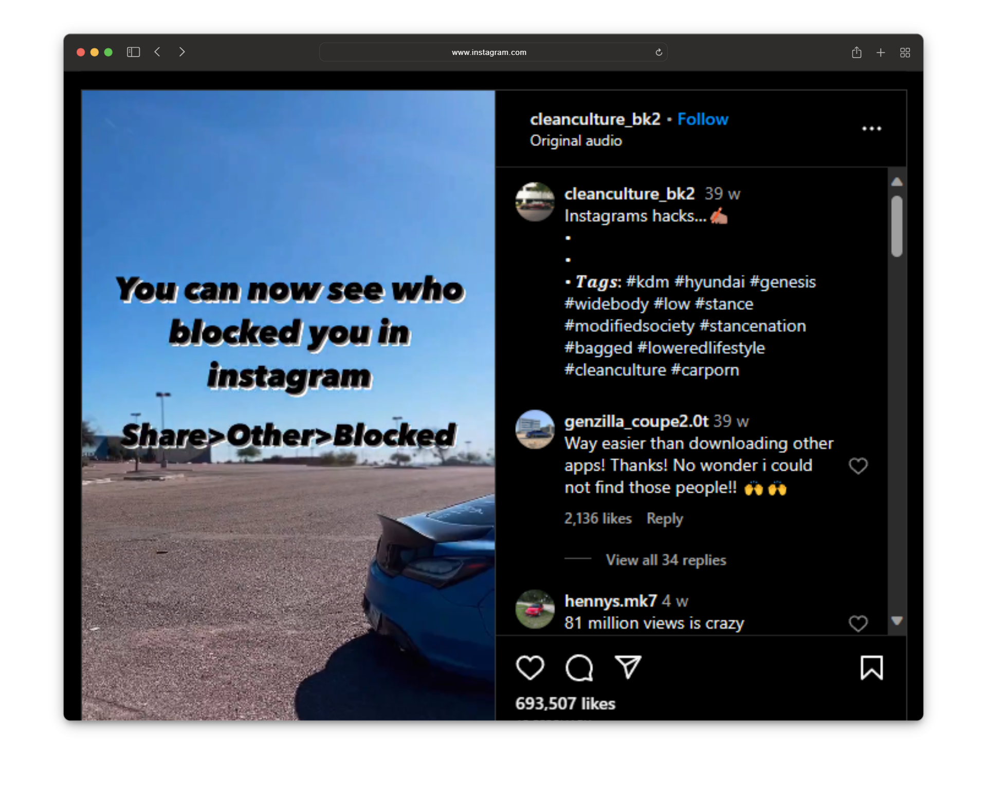 Instagram users have been losing their minds ever since a reel claiming you can now see who has blocked you on the platform was posted by @cleanculture_bk2. It got trendy by having almost 700,000 likes and 81.8 million views.