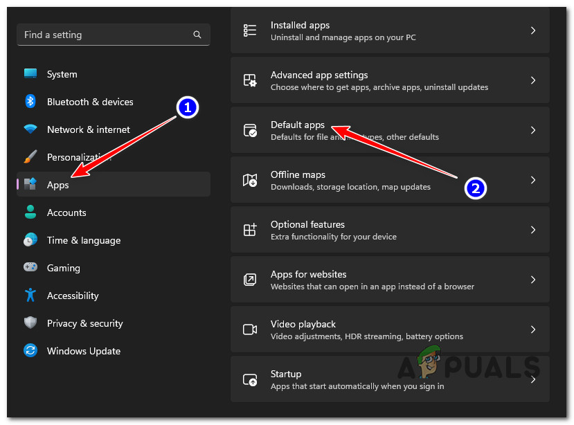 - Once you’re inside the Settings menu, click on Apps from the vertical menu on the left, then click on Default apps from the menu on the right.