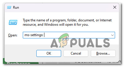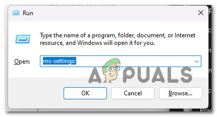 - Press Windows key + R to open up a Run dialog box. Next, type ‘ms-settings:’ inside the Run box, then press Ctrl + Shift + Enter to open up the Settings menu.