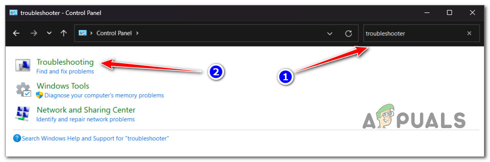 - Once you’re inside the classic control panel menu, use the search function at the top to type ‘troubleshooter’, then press Enter to get the results.