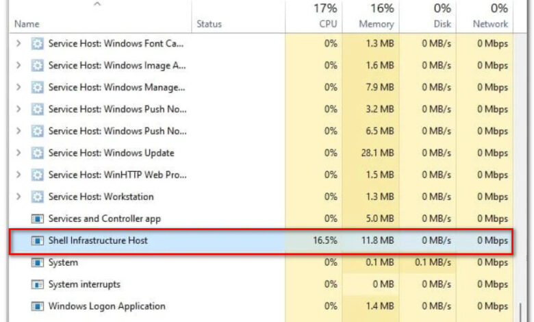 Ironically, a virus infection can also be indicated by a high CPU utilization by the Shell Infrastructure Host process. The Shell Infrastructure Host file may be malware in disguise that is attempting to access system resources by impersonating a system process.