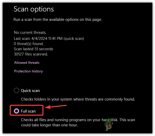 - Choose Full Scan to have a comprehensive check of the files and programs on your hard drive. As this scan can take over an hour to complete, consider using the last method if you prefer not to wait.