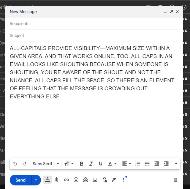 All-capitals provide visibility—maximum size within a given area. And that works online, too. All-caps in an email look like shouting because when someone is shouting, you’re aware of the shout, and not the nuance. ALL-CAPS FILL THE SPACE, so there’s an element of feeling that the message is crowding out everything else.