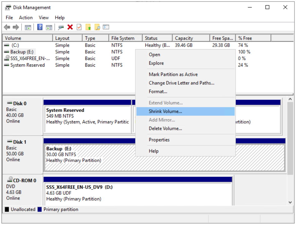 - Right click on the Disk 1 (50.00 GB) and then click Shrink Volume…