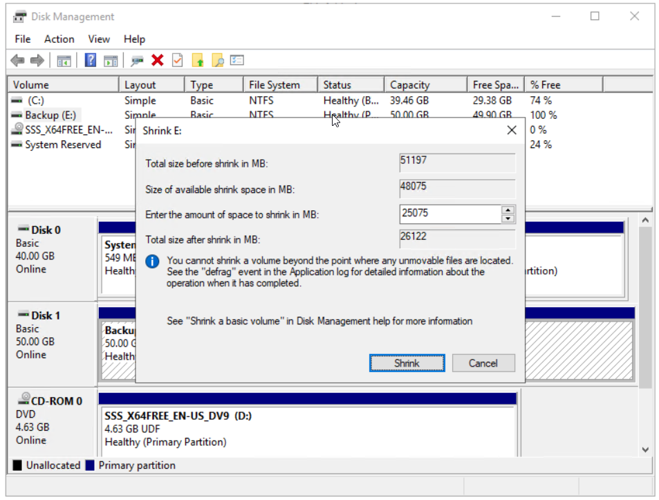 - Enter the amount of space to shrink in MB and then Shrink. In our case, we will shrink the volume to 25 GB. Please note that you cannot shrink a volume beyond the point where any unmovable files are located.