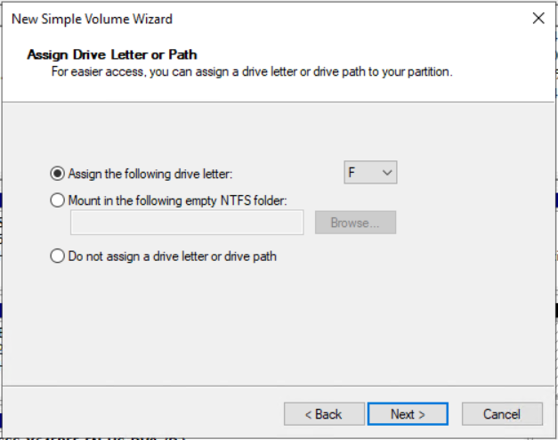 - Assign the following drive letter and click Next. In our case it is F: