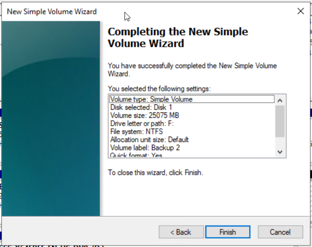 - Under Completing the New Simple Volume Wizard check the configured settings and then click Finish