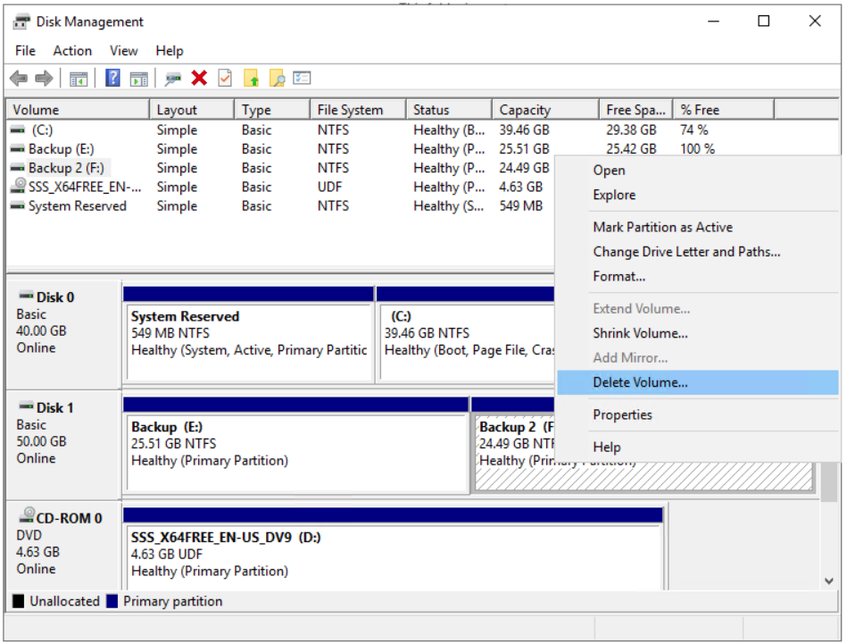 - Right-click on the Backup 2 partition that we have previously and then click Delete Volume.