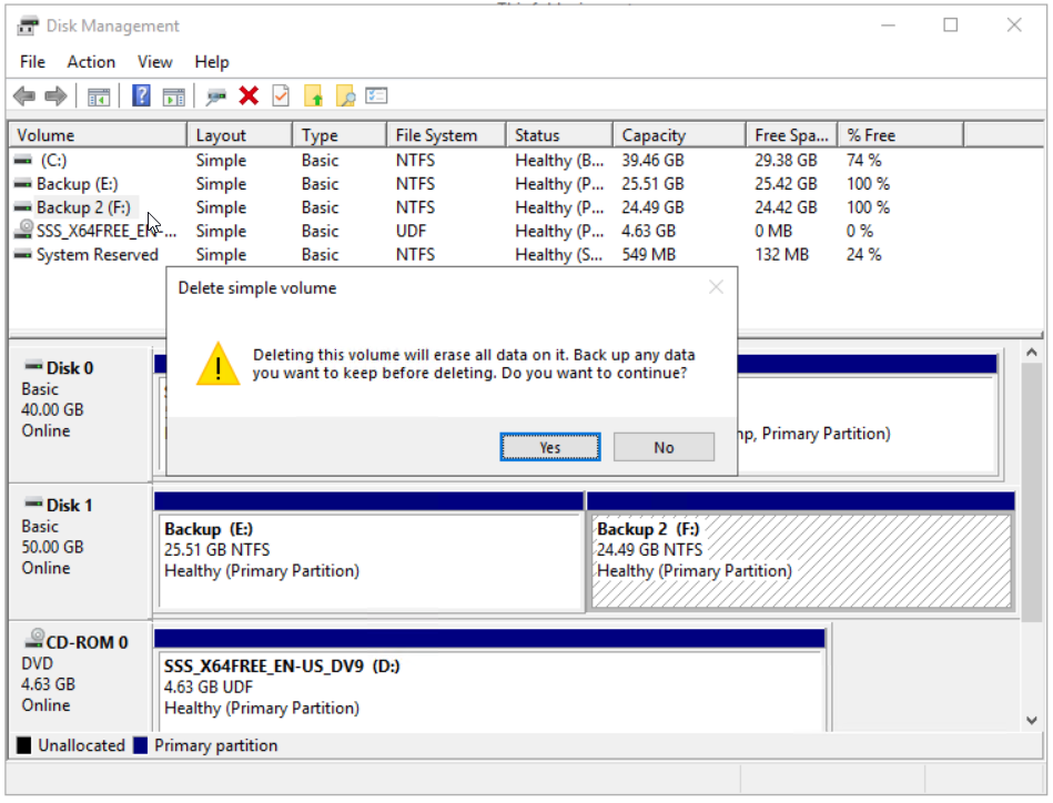 - Under Delete simple volume click Yes to delete the volume