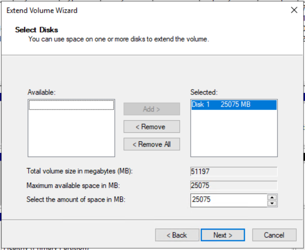 - Under Select Disks, select the volume and then click Next. In our case, the selected disk is Disk 1 25075 MB.