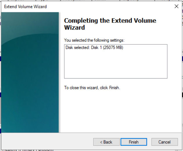 - Under Completing the Extend Volume Wizard check the settings and then click Finish