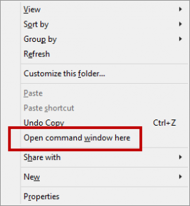 - On your computer, navigate to the path where the APK you want to sideload is located. Somewhere in that folder, Shift+right click on an empty space and select Open command window here.