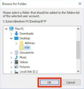 - Select a folder that will be used to share files over the FTP connection. I would advise you to create a folder exclusively for that purpose. After you click OK, the FTP connection will be functional.