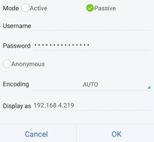 Note: If you don’t know your IP address, open up a Command Prompt and type ipconfig. - Under Username, insert the username you created while setting up the FTP server on your PC. Leave the Password field blank and don’t change anything else. Click OK finish setting up the FTP server.