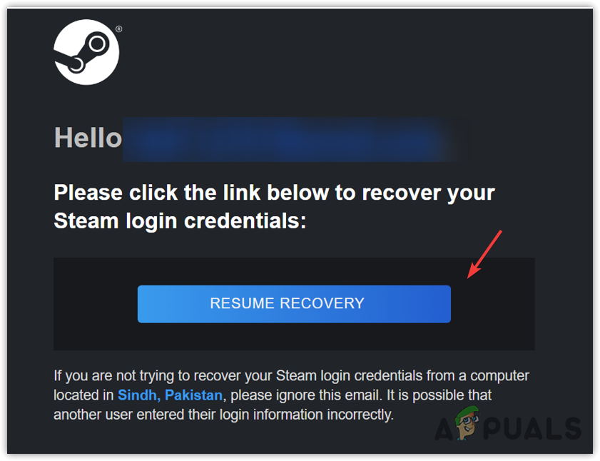 - Once you received the email, click Resume Recovery to open the link to recover your Steam login credentials.
