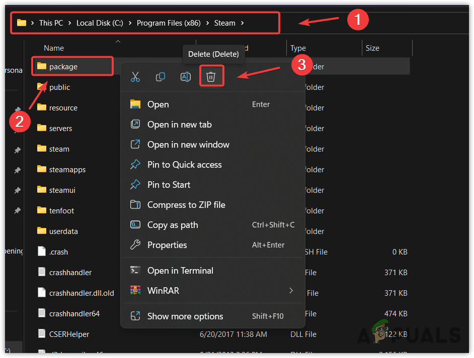 The Steam package folder stores information about games and user data. It is an essential folder for Steam, as it manages updates, installation, and user data. Hence, if the files within this folder become corrupted, you might encounter this error. Therefore, try deleting the Steam package folder, which will automatically be created when you run Steam.exe.