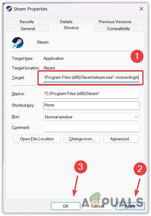 The launch parameter we are going to use is -noreactlogin. It is accepted by Steam.exe and can be used to revert to the new login UI. This will disable the ReactJS login screen, which will return to the old login window. To use this command, you will have to add it to the target value at the end of Steam.exe. To do this, follow these steps: