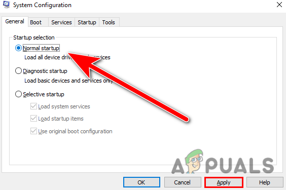 Type MSconfig in the Run program - In the next Window, select Normal Startup and click on Apply button.
