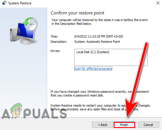 Select the restore point - Click on the Finish button to confirm and start the restore process.