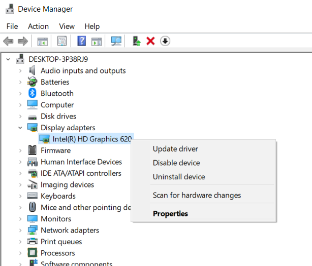 Device Manager - Right-click and select Update Driver. Choose the Search Automatically option and wait for Windows to automatically install the latest drivers.