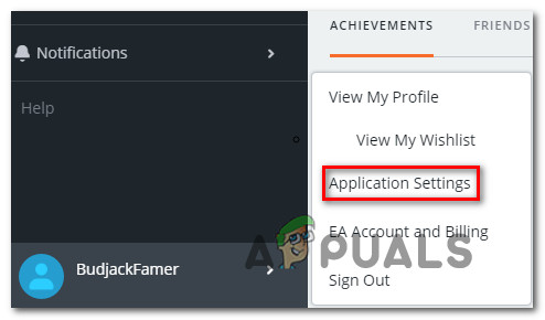 - Once you are inside the main menu, click on the account name (bottom section of the screen and choose Application Settings from the newly appeared drop-down menu.