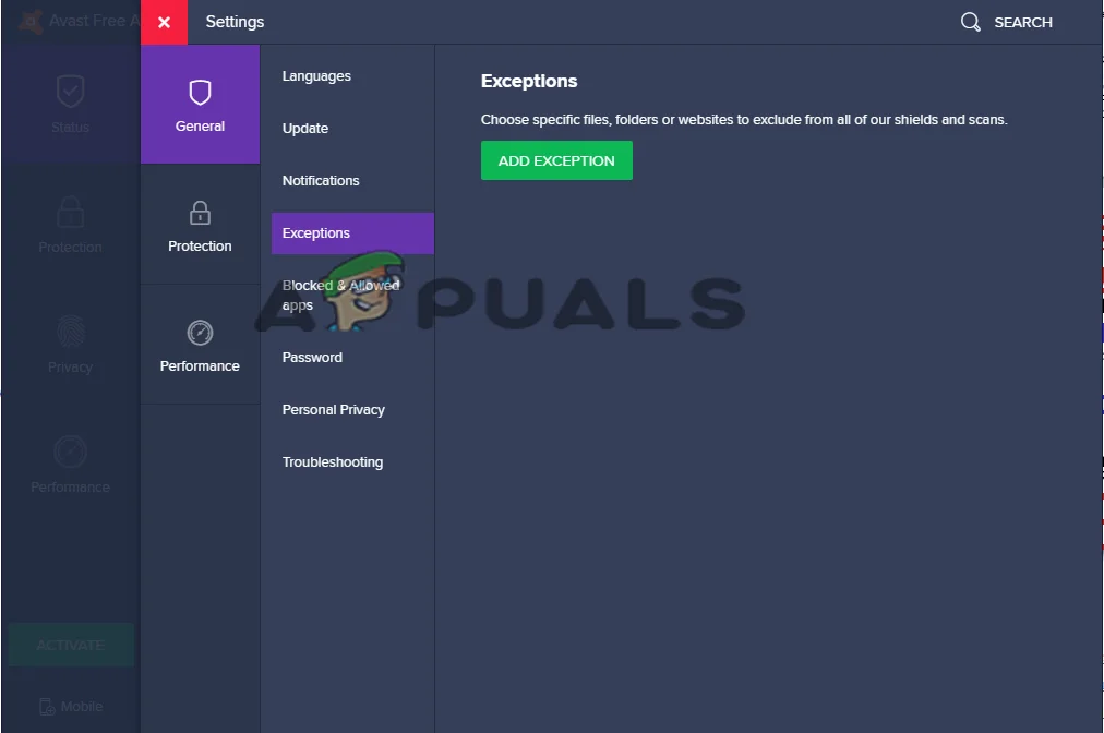 Click on the Exclusions option in Avast - Save the settings and reboot your system for the changes to take effect.