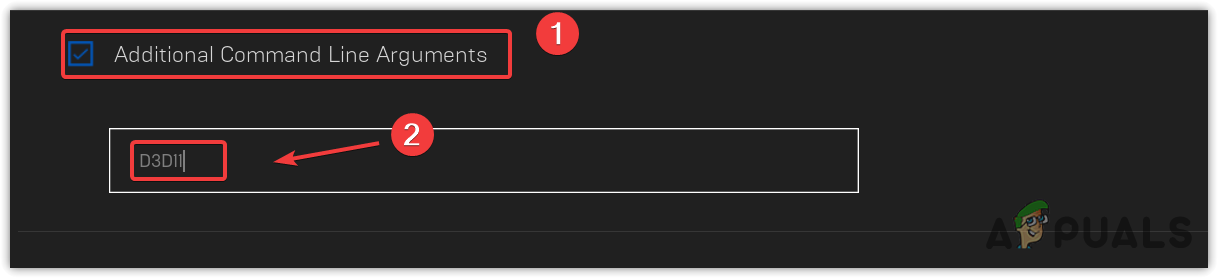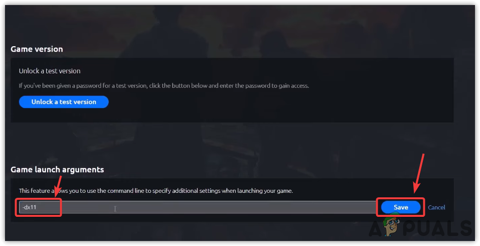 - In the right pane, under Game Launch Arguments, click Add Command Line Arguments, type the -dx11 command, and click Save.