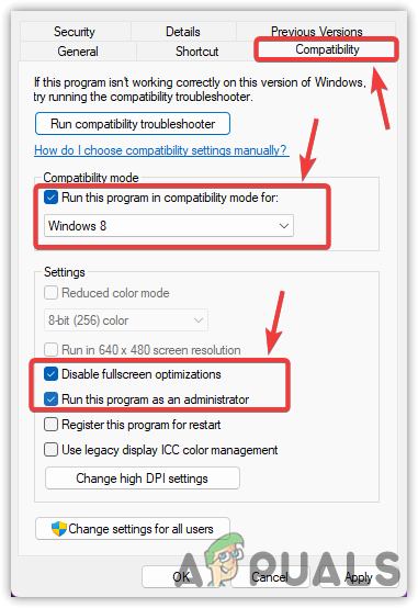 - In the Compatibility tab, check Run this program in compatibility mode for: and select Windows 8 from the drop-down list.
