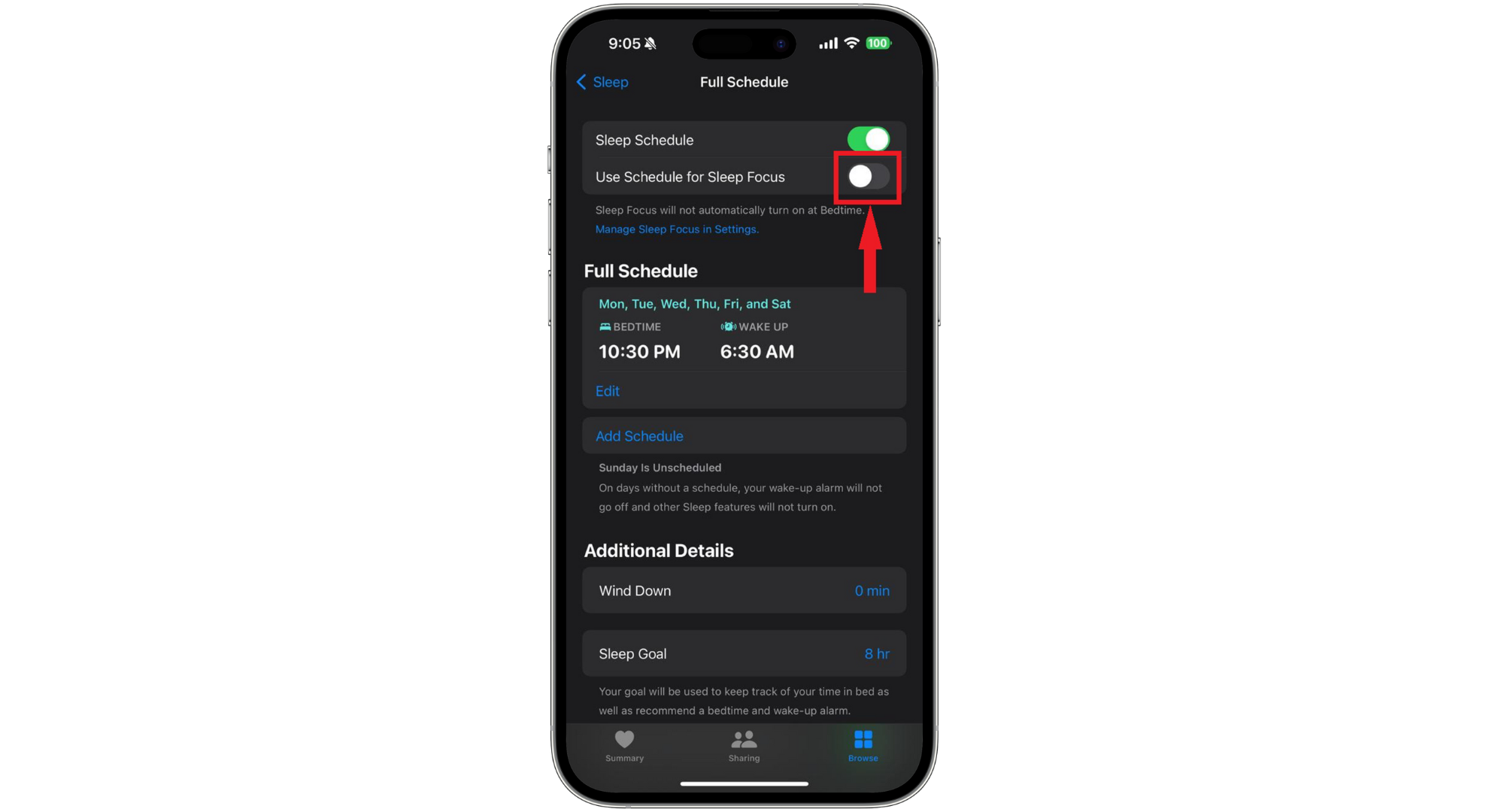 If you want to stop Sleep Mode from automatically turning on, use the Health app. Go to the Browse tab, select Sleep, scroll to Your Schedule, and tap on Full Schedule & Options. Toggle off “Use Schedule for Sleep Focus.”