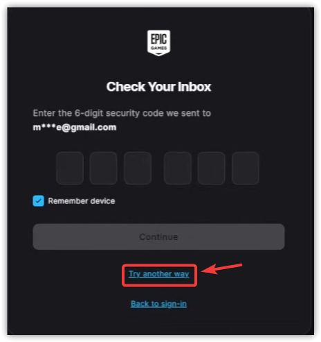 Keep in mind that the Try another way option will only appear if additional authentication methods (such as email or an authenticator app) were already enabled on your account. If SMS is your only configured method, you may need to use backup codes or contact Epic Games Support.