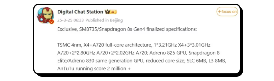 In a post on Weibo, translated from Chinese, the company has given no exact details on the internal specifications. If previous rumors are anything to go by, it’ll likely be the Snapdragon 8s Gen 4, the successor to last year’s mid-range 8-series chip, the 8s Gen 3.