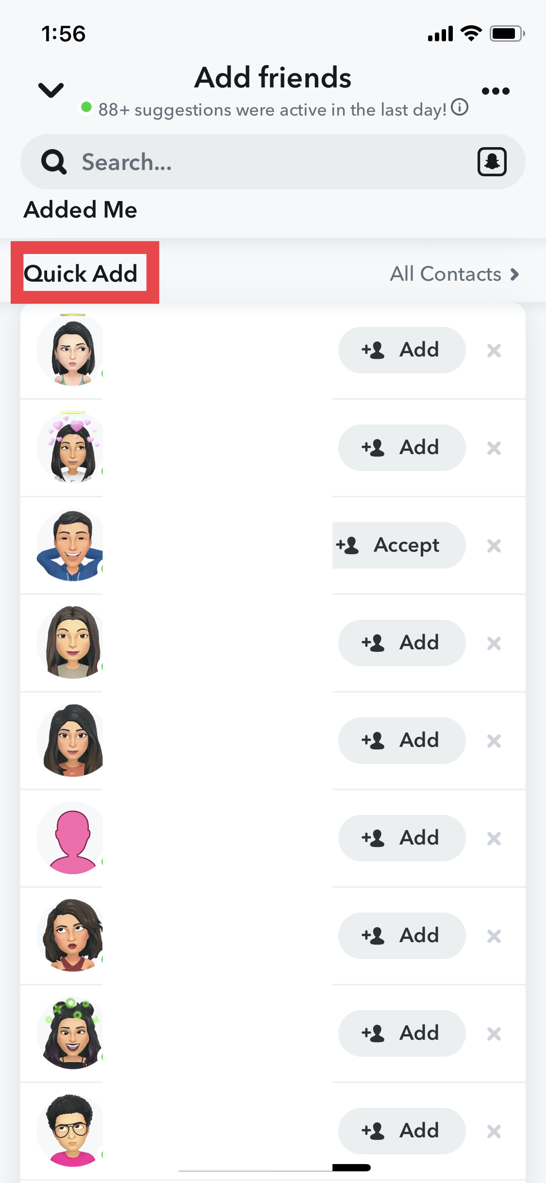 - To search for usernames directly, tap the Search icon at the top right—next to your Bitmoji.
