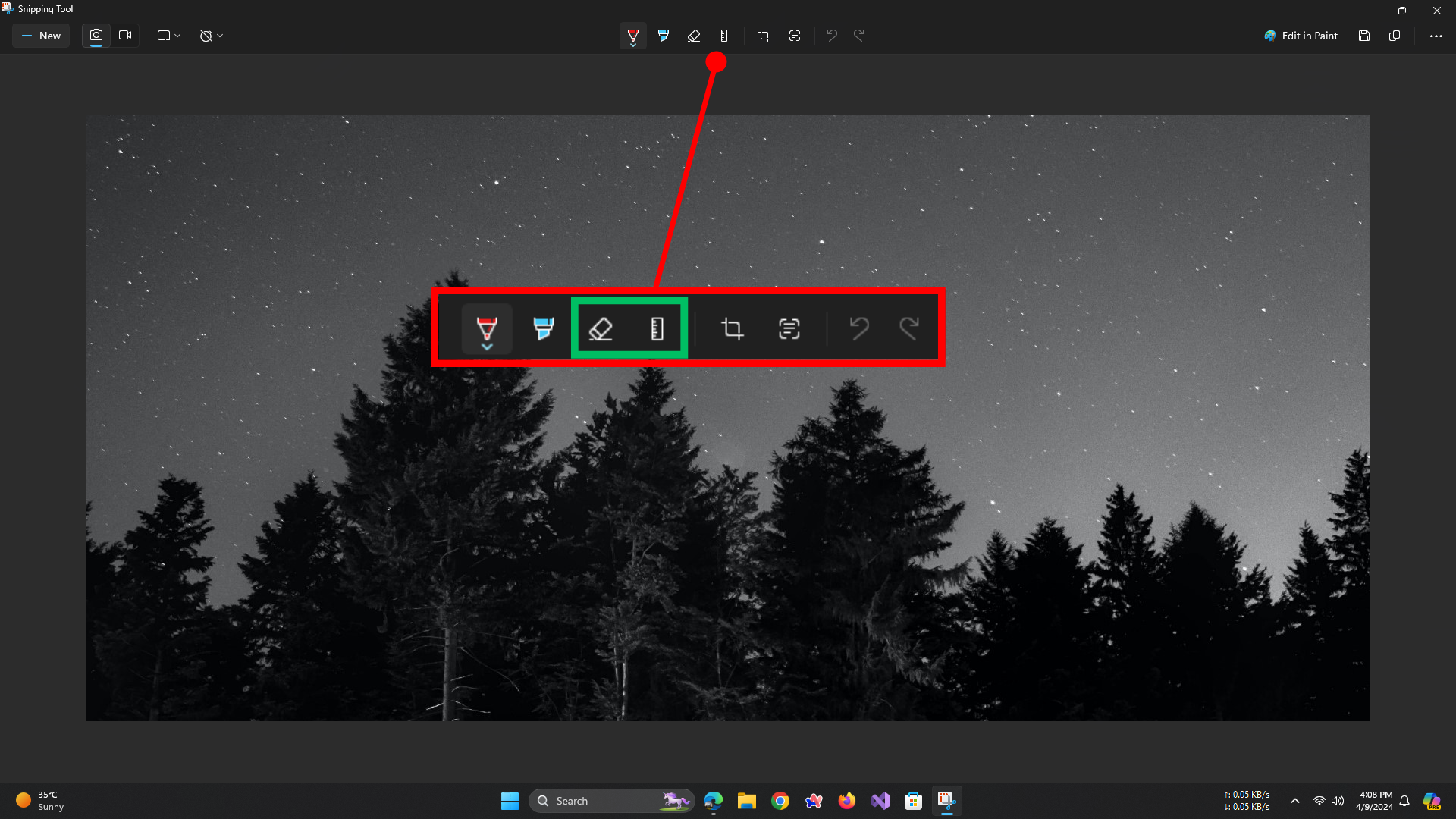 - Use the Ruler to draw straight lines and the Eraser to delete strokes. Additionally, you can select the ‘Edit in Paint’ option in the toolbar to further edit your screen capture in the full-fledged Paint app for Windows.